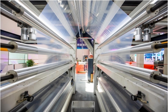 尤其在 PE 包裝收縮膜領域,五層共擠工藝不僅延續了減薄降本的共性優點,還極大地提高了薄膜的光學性能和展示效果。數據顯示,采用我司五層阻隔薄膜吹膜機制備的收縮膜,在保持優秀機械性能的同時,其光學性能實現了質的飛躍,透明度和印刷適性大幅提升,助力客戶打造出更具吸引力的終端展示效果。